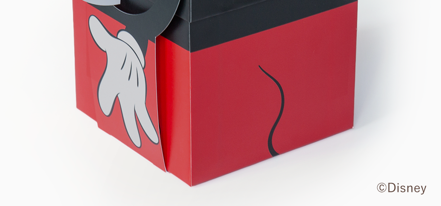 ミッキーマウスをイメージしたパッケージは赤いズボンと大きな手をデザイン。
